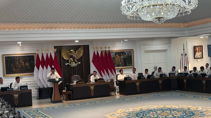 Presiden Republik Indonesia, Prabowo Subianto, memimpin jalannya sidang kabinet di Istana Negara, Jakarta, pada Senin (5/5/2025). Wakil Presiden Gibran Rakabuming Raka turut hadir mendampingi, bersama para menteri dan wakil menteri Kabinet Indonesia Maju.